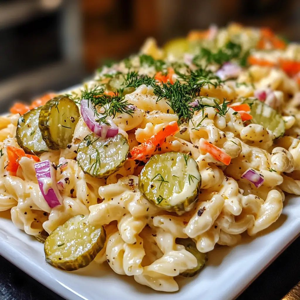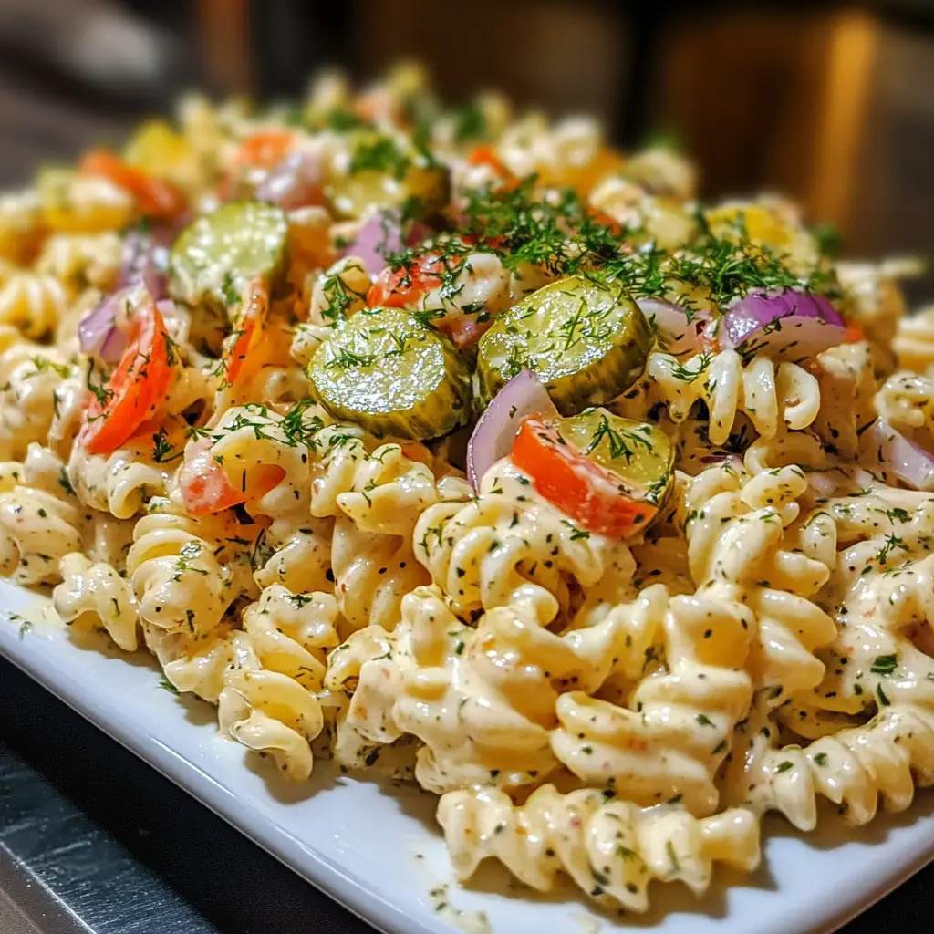 A refreshing and tangy pasta salad featuring ranch dressing and dill pickles, perfect for summer gatherings.