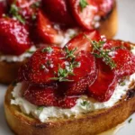 Assemble: Spread the whipped ricotta generously over the warm toast. Next, spoon the luscious roasted strawberries and their juices atop. Don’t forget to garnish with lovely thyme leaves and a pinch of sea salt for that flavor pop. Serve immediately to enjoy the warm ensemble while the bread holds its crunch.