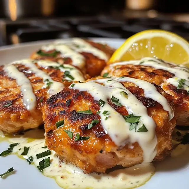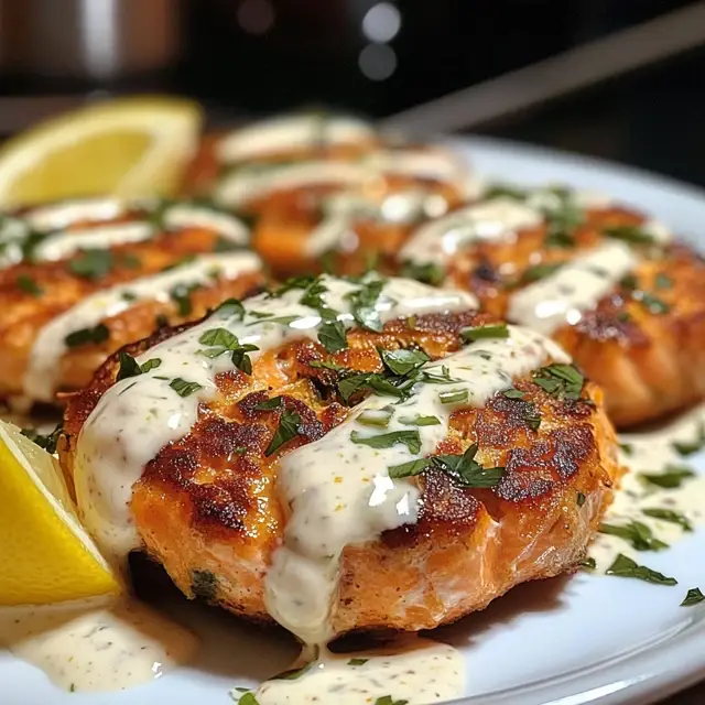 Delicious salmon patties served with a creamy lemon-garlic sauce, perfect for a quick and healthy meal.