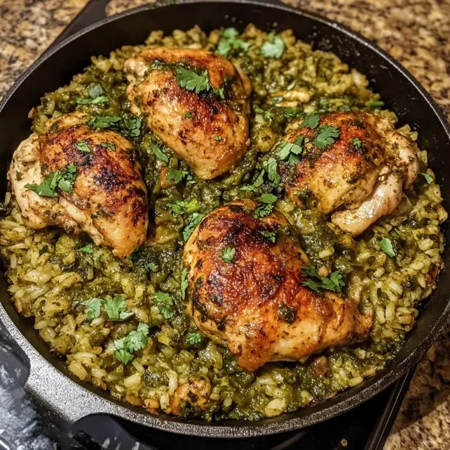 Salsa Verde Chicken & Rice Skillet is a delicious one-pan meal that combines tender chicken, flavorful salsa verde, and fluffy rice for a quick and satisfying dinner.