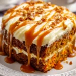 A delightful carrot cake layered with cream cheese frosting and drizzled with rich salted caramel.