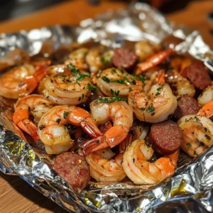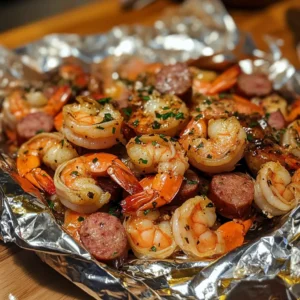 Now it’s time to create your foil packs! Tear off large sheets of aluminum foil, about 12 inches long. Divide the shrimp and sausage mixture evenly among the sheets. Fold the foil over the mixture, creating a sealed packet. Make sure to crimp the edges tightly to prevent steam from escaping. This is where the magic happens, as the ingredients will steam and cook beautifully inside the foil!