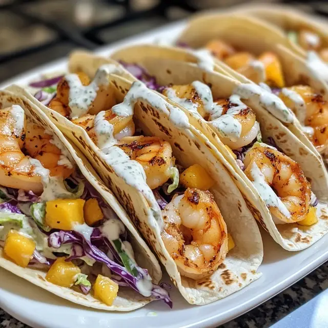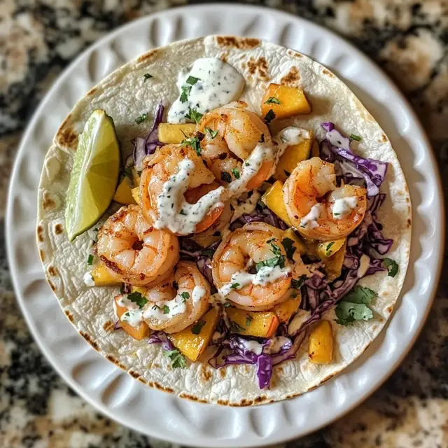 A delicious and vibrant dish combining shrimp and peaches in tacos, topped with a refreshing slaw and zesty lime crema.