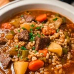 A comforting and hearty soup made with tender beef, nutty barley, and savory vegetables, perfect for chilly evenings.