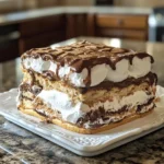 Once you’ve completed the layers, cover the cake with plastic wrap and freeze it for at least 4 hours, or until it’s firm. When you’re ready to serve, slice it into squares and enjoy this delightful S’mores Ice Cream Sandwich Cake chilled. It’s a treat that’s sure to bring smiles all around!