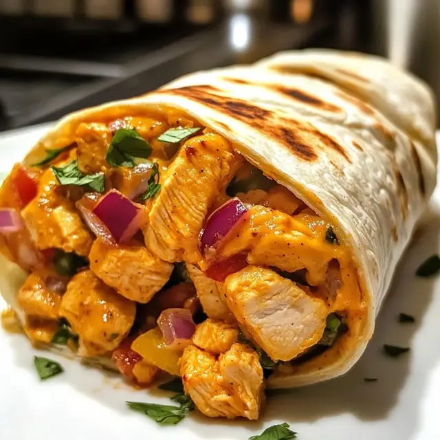 A flavorful and satisfying wrap filled with seasoned chicken, fresh vegetables, and a zesty sauce, perfect for a quick meal.