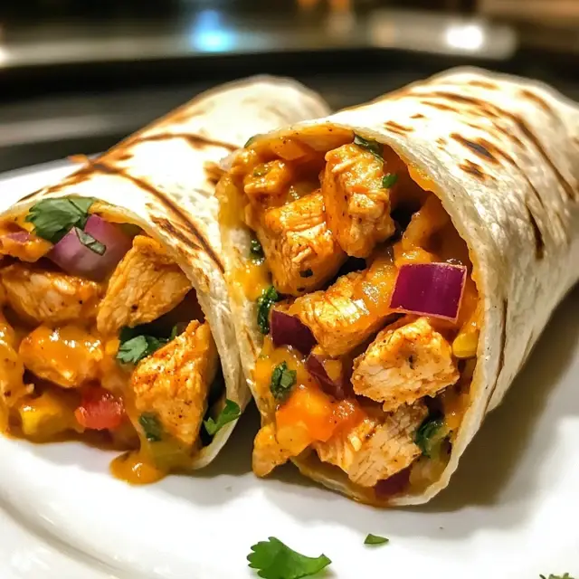 Now it’s time to lay out your tortillas on a clean, flat surface. This is where the fun begins! Divide the chicken mixture evenly among the tortillas, placing it in the center. Next, add the sliced avocado and a generous sprinkle of shredded cheese on top. The creamy avocado and melty cheese will elevate the flavors. Don’t be shy—load them up! Once everything is in place, you’re ready to wrap it all up tightly, ensuring every bite is packed with goodness.