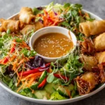 As I stand in my kitchen, the vibrant colors of the Spring Roll Salad with Peanut Dressing come to life before my eyes. The crisp greens glisten under the light, while the shredded carrots and julienned cucumbers add a playful crunch. Each ingredient seems to beckon, promising a delightful explosion of flavors and textures. The creamy peanut dressing, with its rich, nutty aroma, envelops the salad like a warm hug, inviting you to take that first bite.