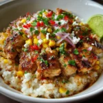 A delicious and vibrant Street Corn Chicken Rice Bowl that combines grilled chicken, sweet corn, and flavorful spices for a satisfying meal.