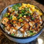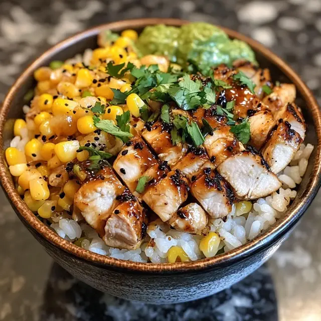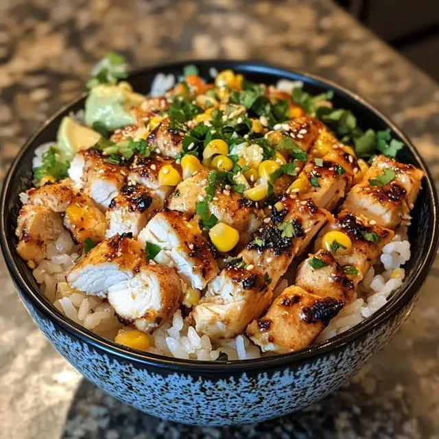 A delicious and vibrant Street Corn Chicken Rice Bowl that combines tender chicken, sweet corn, and flavorful spices for a satisfying meal.