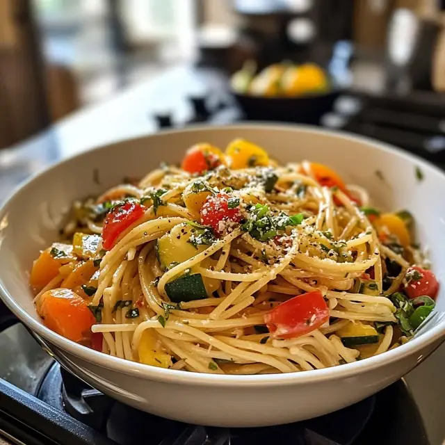 A vibrant and fresh pasta dish featuring a variety of summer vegetables, perfect for a light meal.