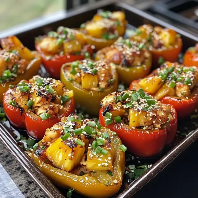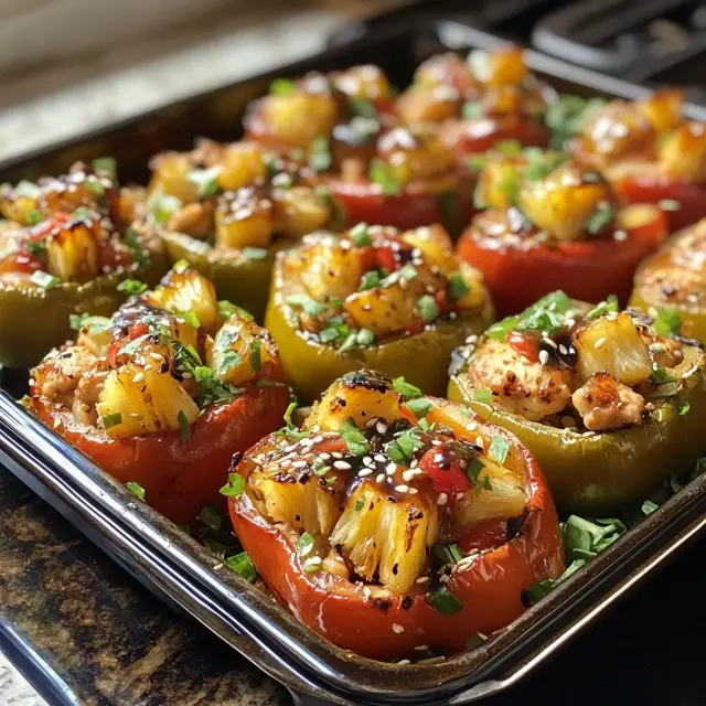 A delicious and healthy dish featuring bell peppers stuffed with a savory mixture of chicken, teriyaki sauce, and pineapple.